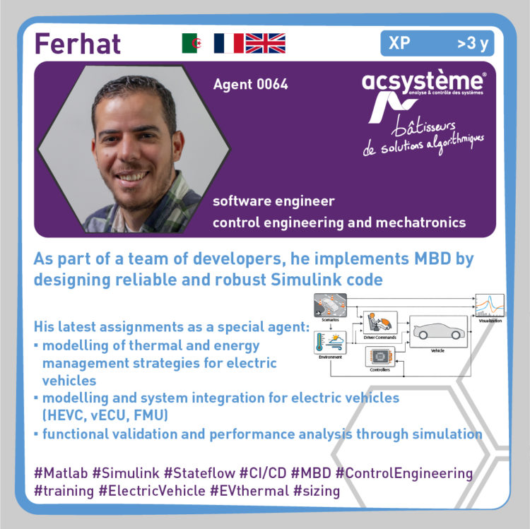 Ferhat – Agent 0064: For over three years, he has been working with our clients to develop Simulink models, design simulation platforms, and validate control functions for automotive manufacturers and the defense sector, including thermal management and electric propulsion.