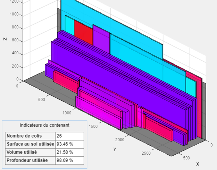 Pour répondre à cette problématique, nous avons développé un algorithme sur mesure, pensé pour les équipes de production et de logistique. L’objectif est double : fiabiliser la palettisation des panneaux, majoritairement robotisée, et organiser efficacement l’empilement des colis complémentaires, ajoutés manuellement. Le tout, en minimisant le nombre de contenants utilisés et en maximisant le taux de remplissage des transports.